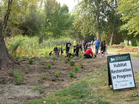 Riverside Marsh is a oxbow that was once part of the Okanagan River. Oxbows are the curves in a river that have become cutoff from the main channel, whether naturally or via human engineering. Between 2016 and 2020 Okanagan Similkameen Stewardship planted over 2500 native, trees, shrubs, wild flowers and grasses on the site in partnership with the City of Penticton and with the help of over 300 volunteers.